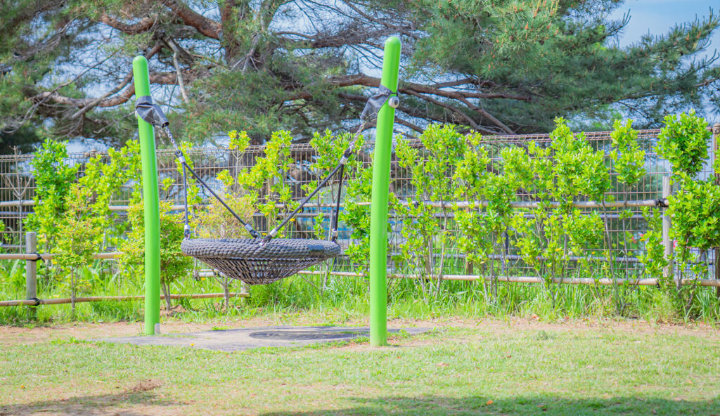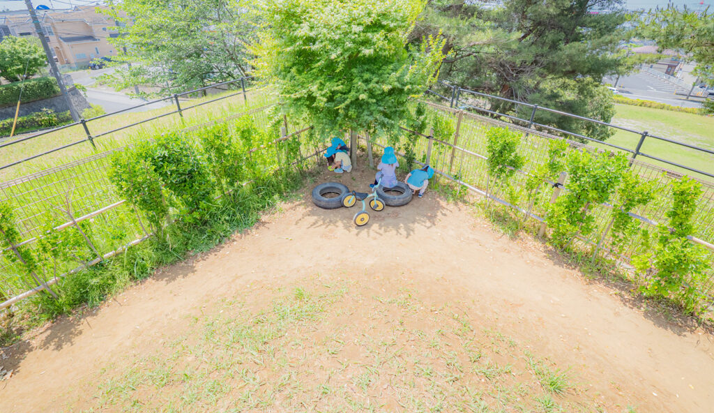 この土地を永い間見守ってきた、栴檀(せんだん)の木や松、鬼ぐるみの木に守られながら、虫や鳥たちが集い、風が心地よくそよぎ、雲が流れる園庭で、子ども達は全身(五感)を使ってのびのびと遊ぶ環境にあります。