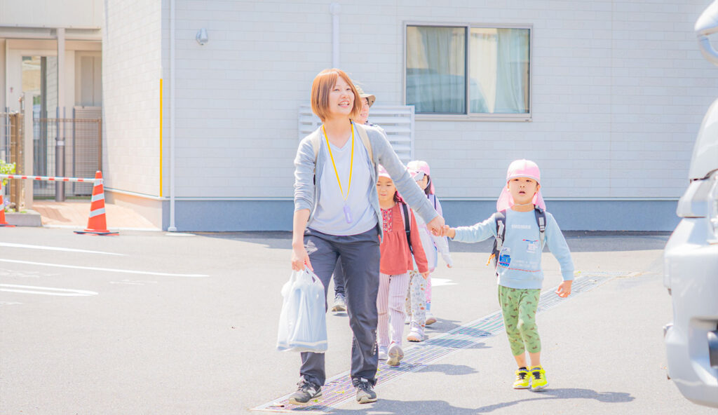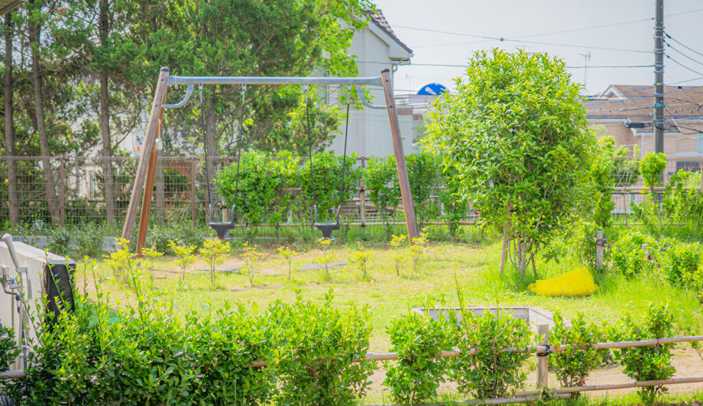 平屋の園舎は、おゆみ野だいだいぶし公園を見下ろす自然環境豊かな 高台に建っています。